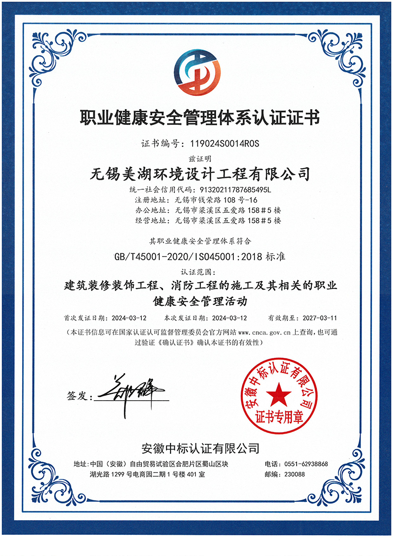 职业健康安全管理体系认证证书